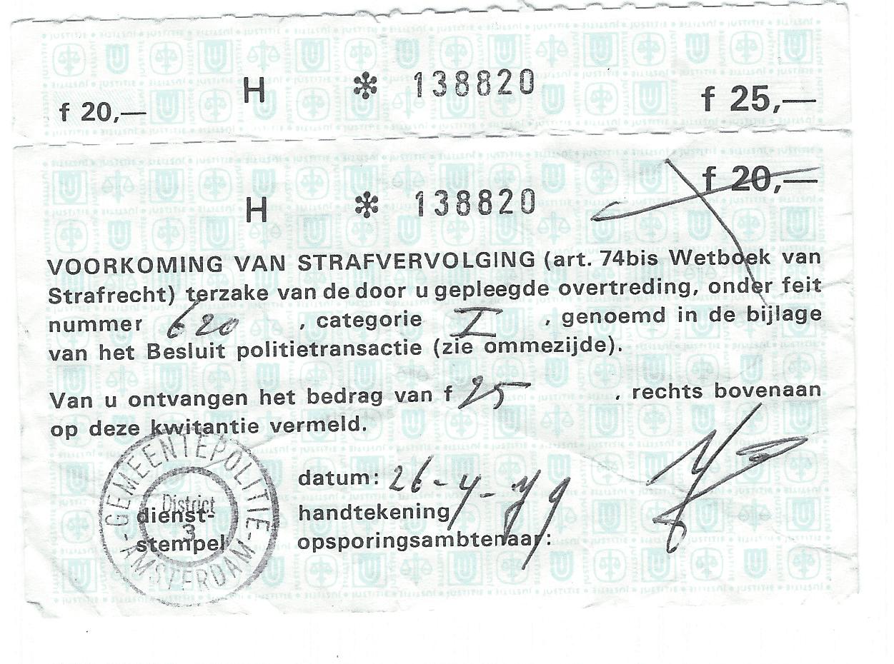 Bekeuringen konden in die tijd nog contant betaald worden aan de agent die de bekeuring uitschreef. Het nadeel daar van was dat je als agent altijd met geld van de staat op zak liep en ook nog voor wisselgeld moest zorgen.