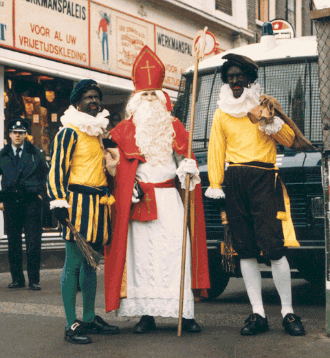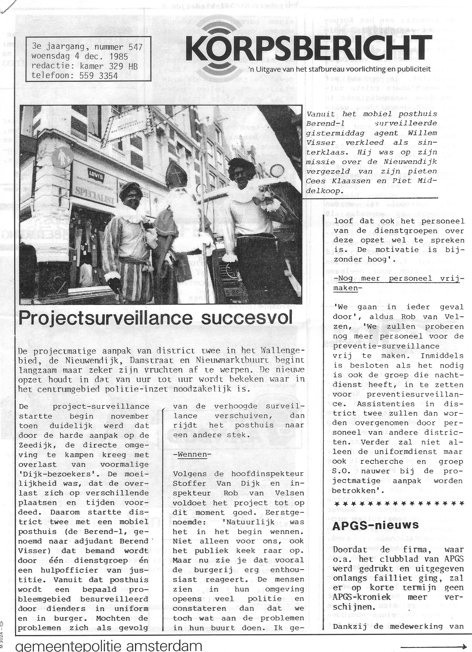 "Sint aast op goklustigen" kopten de kranten op 5 december 1985.Om de "balletje-balletje-medewerkers" het leven zuur te maken op de Nieuwendijk en omgeving besloten wij (groep 4) een ludieke aktie te gaan houden. ik had via via 2 pieten pakken en 1 Sint pak kunnen lenen en op 5 december was het dan zo ver. Geschminkt en voorzien van portofoon en gummilat togen wij richting Nieuwendijk. Je was wel gewend dat mensen naar je keken als je in uniform surveilleerde, maar dit was toch wel effe iets anders.